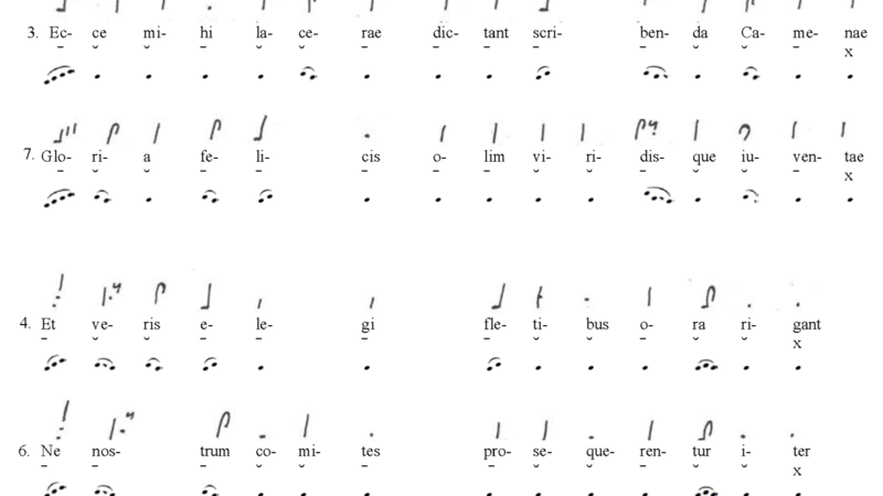 Notation was added in the Cambridge leaf to the opening 8 lines of the 22-line poem, which was written out in full. The neumes alone indicate a distinctive melodic profile. The following remarks refer to the example below, in which notations are aligned for hexameter lines 3 and 7, and pentameter lines 4 and 6; scansion signs are placed beneath each syllable to indicate metrical quantity, and stemless noteheads clarify the basic information transmitted by each neume about discrete pitches. Each line opens with an initial rise in the melody represented by signs placed in a rising trajectory over the first syllable. This opening rise is followed by a flexible pattern of ascents and descents indicated by signs in the shape of crooks (two descending tones or a clivis) and ticks (two ascending tones or a pes). This sequence of varied length ends in a single tone at the mid-point of the verse line, which corresponds to a fixed break or caesura in the verse after two and a half dactylic feet, i.e. - ⏕ | - ⏕ | -. Towards the end of the line, the neumes indicate cadential patterns that begin at the point that the text enters into a fixed metrical and accentual pattern, namely 5 syllables from the end of the line in the odd-numbered dactylic lines and 7 from the end in the even-numbered pentameter lines.