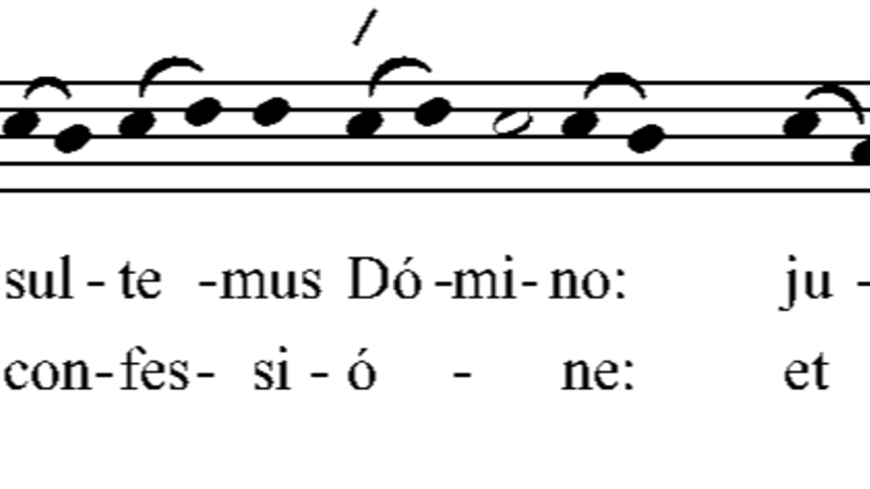 This way of singing a text corresponds to principles of recitation used in psalm singing, for which formulae known as Tones were used to chant verses of varying length. By way of illustration, the words of the first two verses of Psalm 94 are set below to a standard formula known as Tone 2 taken from an early tenth-century treatise on psalmody known as the Commemoratio brevis.[1] Each psalm verse is split into two parts around a central caesura. After a rising intonation there is recitation on a single tone, followed by a pattern of descending and ascending two-tone figures five or six syllables before the caesura depending on whether the final accent is penultimate or antepenultimate. Following the caesura, a new falling and then rising two-note intonation leads to further recitation on a single tone before a cadence fixed four syllables from the end that returns from the recitation tone to the final.
