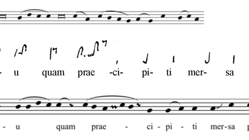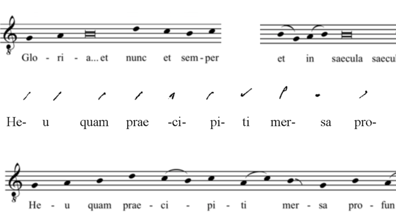 The wider notated tradition provides a way into understanding the relatively elaborate melody notated in the Cambridge leaf. The profile of a melody recorded for Heu quam praecipiti in the late ninth or early tenth century at the Abbey of Sankt Gallen (Naples, Biblioteca Nazionale IV. 68) accords with a solemn Tone 3 as recorded in the early tenth-century treatise Commemoratio brevis.[1]